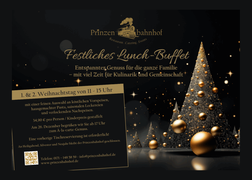 Am 25. und 26. Dezember lädt der Prinzenbahnhof zum festlichen Weihnachtsbuffet ein – mit winterlichen Klassikern, feinen Desserts und viel Zeit zum Genießen.